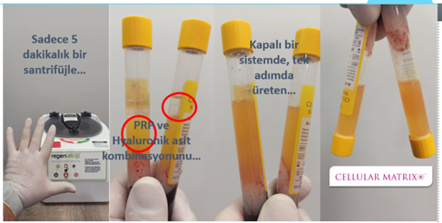Yukarıda gördüğünüz fotoğraf kolajı içinde toplam 40 mg (2 ml) hyaluronik asit ve 1 ml sodyum sitrat bulunan bir Cellular Matrix tüpüne 6 ml an alımından sonra 5 dakikalık bir işlemi sonucunda 2ml hyaluronik asit ve 3 ml PRP içeren bileşimin havayla veya başka bir materyalle temas etmeden ne derece kolay ve güvenli bir biçimde hazırlanabildiğini göstermektedir. Doku rejenerasyonu açısından son derece önemli bu iki bileşenin bir araya getirilmesindeki bilimsel dayanağı 9 maddede özetleyebiliriz: